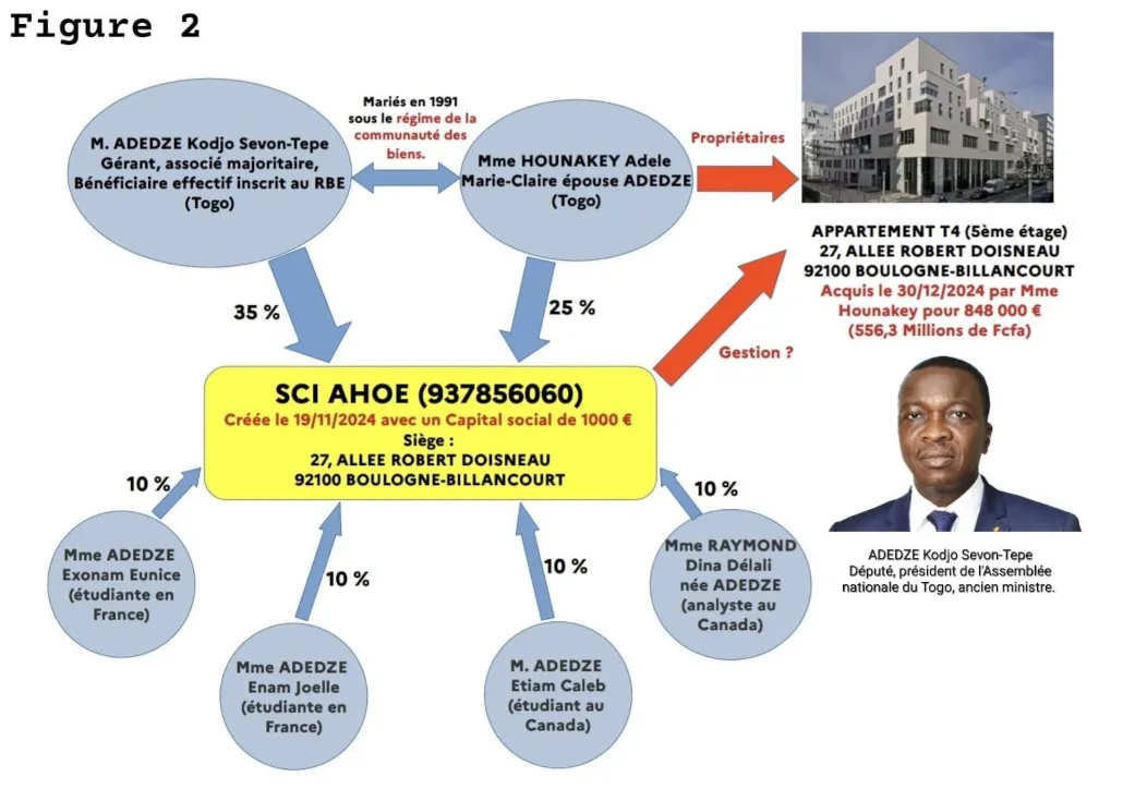 Il ressort des documents publiés que M. Adédzé, Président en exercice de l’Assemblée du Togo depuis mai ou juin 2024, est non seulement l’associé majoritaire et le bénéficiaire effectif de la SCI AHOE, mais on découvre qu’il est également le gérant de cette société créée depuis novembre 2024.