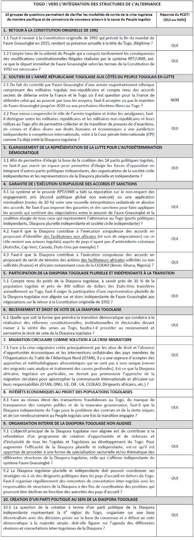 Aussi, le Réseau de coordination de la Diaspora togolaise indépendante souhaite que chaque citoyen togolais, mais aussi les vrais amis du Peuple togolais puissent apporter une réponse en âme et conscience sur les points qui font litiges actuellement.