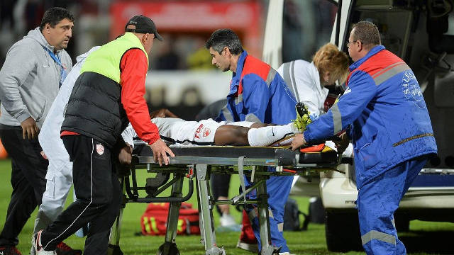 Patrick Ekeng évacué après un malaise. Il mourra quelques minutes plus tard faute d'équipements de soin appropriés dans l'ambulance qui l'a transporté à l'hopital | Photo : Agences