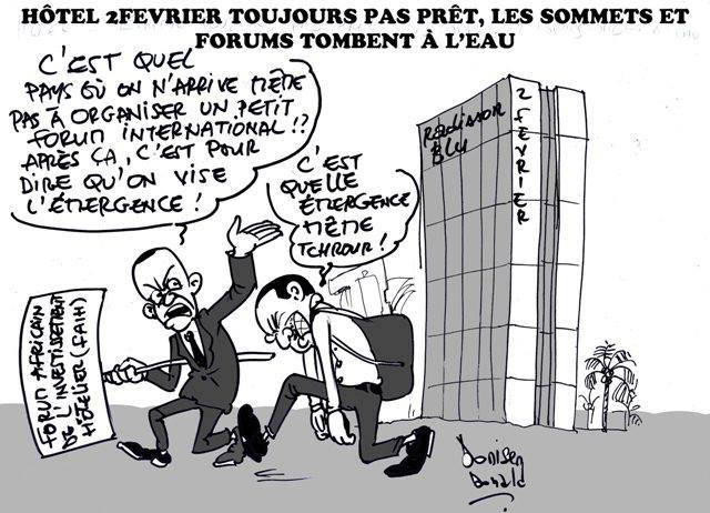 En janvier et février, des visites inopinées ou programmées ont été effectuées par le premier des ministres dont le sport favori est la lecture des discours et sa suite. Il nous est même revenu qu’il a failli faire un vol plané sans parachute lors d’une de ses visites. Bien qu’il ait rassuré que les travaux avancent comme sur des roulettes, les citoyens ont été informés, comme la première fois, que le sommet ne se tiendra plus. Rendez-vous était repris pour octobre. Mais pour meubler ce temps d’attente, on s’est arrangé pour faire tenir une rencontre de haut niveau dans l’hôtel. Il s’agit du Forum Africain pour l’Investissement hôtelier prévu les 5 et 6 avril prochain. Mais aux dernières nouvelles, on apprend aussi cette rencontre internationale n’aura plus lieu. La raison, les travaux de rénovation de l’hôtel Radisson Blu hôtel 2 Février devant abriter ce rendez-vous ont pris des retards. Manifestement, un signe indien s’acharne sur cet hôtel 5 étoiles. Il se murmure qu’il reste plusieurs étages à rénover.