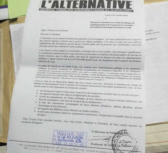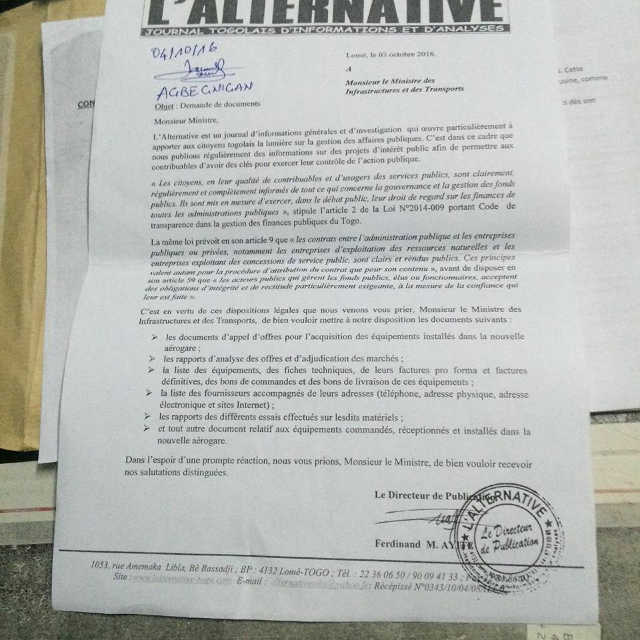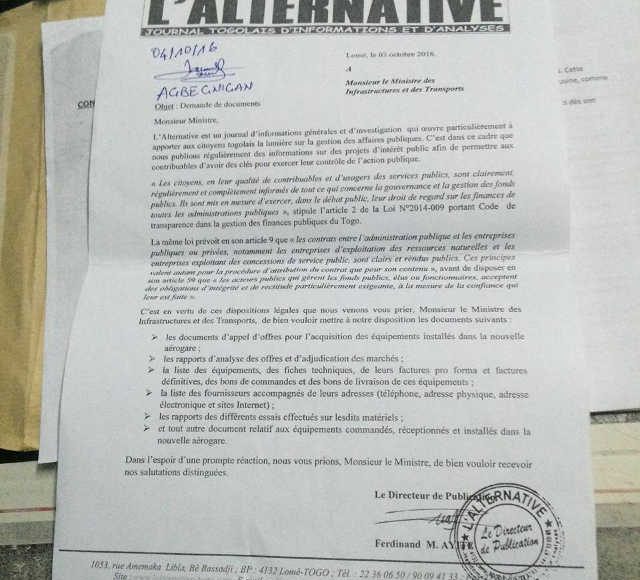 Le cas des trois scanners devenus des pièces détachées en est une illustration. Au regard des actes de prévarication graves de Gnama Latta et Ninsao Gnofam, et pour avoir une idée réelle du processus d’acquisition de ces équipements, la Rédaction de journal L’Alternative a saisi simultanément par courrier le 3 octobre 2016 les deux acteurs afin qu’ils mettent à sa disposition tous les documents liés à la construction de la nouvelle aérogare, et ce, en se basant sur l’article 2 de la Loi N° 2014-09 portant Code de transparence dans la gestion des finances publiques au Togo. Ces deux courriers (copie en fax similé) déchargés au cabinet du ministère des Infrastructures et des Transports le 4 octobre 2016 et le lendemain au secrétariat de l’ANAC, n’ont jamais eu de réponses, preuve suffisante du mépris manifeste et ostentatoire que ces commis de l’Etat appelés à gérer les affaires publiques ont vis-à-vis des contribuables. Le contraire aurait étonné plus d’un. Qu’à cela ne tienne, le feuilleton sur la mauvaise qualité des travaux de la nouvelle aérogare sur fond de détournements n’est qu ‘à ses débuts.