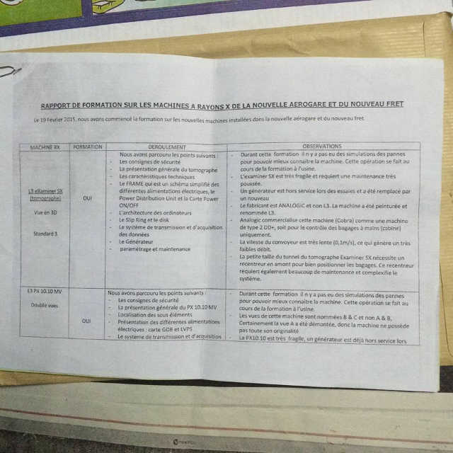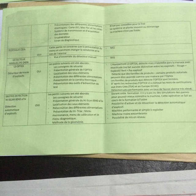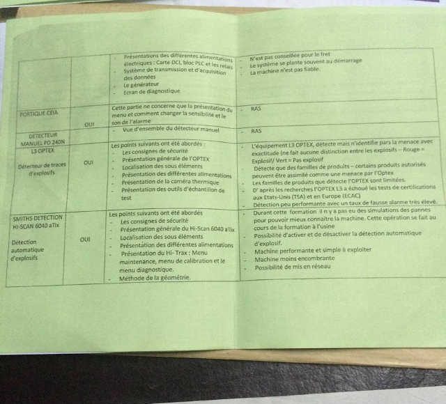 Un examiner SX fragile, un générateur prétendu neuf hors service, du matériel défectueux de marque ANALOGIC, démonté, repeint et renommé L3, un tomographe défectueux, des machines fragiles dont les cartes sont changées toutes les semaines. Plus loin des équipements L3 OPTEX qui n’identifie pas avec exactitude la nature des menaces notamment la distinction entre explosif ou pas d’explosif. Ce matériel L3 OPTEX est tellement limité et défectueux qu’il affiche un taux de fausse alarme élevé. Qui plus est, L3 OPTEX a échoué aux tests de certification aux USA ( TSA) et en Europe (ECAC) comme le précise les observations du tableau. Quant au SMITHS DETECTION HI-SCAN 6040 aTix destiné à la détection automatique d’explosifs, le rapport indique qu’il existe une possibilité d’activer et de désactiver la détection automatique d’explosif. En d’autres termes contrairement à l’usage, l’homme a la possibilité de manier cet appareil et laisser passer des menaces dans les avions. La conclusion de ce premier rapport à la fin des observations résume en quelques phrases le scandale qui découle de l’achat des équipements. « Cette formation a été une formation très théorique. Il n y a pas eu de simulations des pannes pour pouvoir mieux connaitre les machines. Cette opération se fait au cours de la formation à l’usine. Il serait préférable d’envoyer les techniciens pour une formation approfondie en usine, comme on a toujours l’habitude de le faire dans l’ancienne aérogare. Les machines de VISIOM ne sont pas fiables, si possible les remplacer, sinon la nouvelle aérogare n’est pas à l’abri des dysfonctionnements dès son ouverture, du moins changer les deux EDS et le tomographe ». Pourquoi cette formation a été uniquement théorique ? Parce que les techniciens n’ont pas été formés aux usines qui ont fabriqué les machines. Est-ce un oubli ou juste parce que Gnama Latta, Ninsao Gnofam et leurs complices ont préféré acheter les machines au marché noir, quitte à démonter, peindre et changer les marques plutôt que de les acheter dans une usine ?